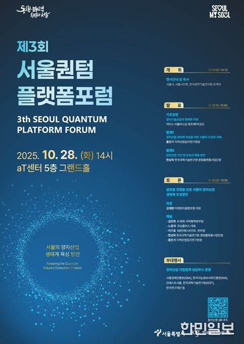 서울시는 한국과학기술연구원(KIST)과 함께 10월 28일 오후 2시, 양재 aT센터 5층 그랜드홀에서 ‘제3회 서울퀀텀플랫폼 포럼(3th Seoul Quantum Platform Forum)’을 개최한다고 밝혔다.