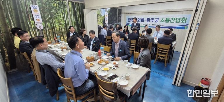 한민일보 서울포커스 박용남 기자 | 완주군의회는 21일 삼례읍 수계리의 한 식당에서 유희태 군수를 비롯한 간부 공직자들과 함께 소통 간담회를 열고, 남은 후반기 임기 동안 의회와 집행부 간 협력 강화와 완주군 발전 방향을 모색했다.