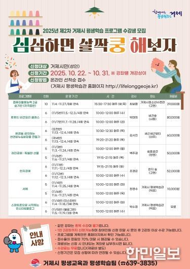 한민일보 서울포커스 김은금 기자 | 거제시는 오는 10월 22일부터 31일까지 ‘심쿵해(심심하면 살짝쿵 해보자)’ 평생학습 프로그램 수강생을 선착순으로 모집한다고 밝혔다.
