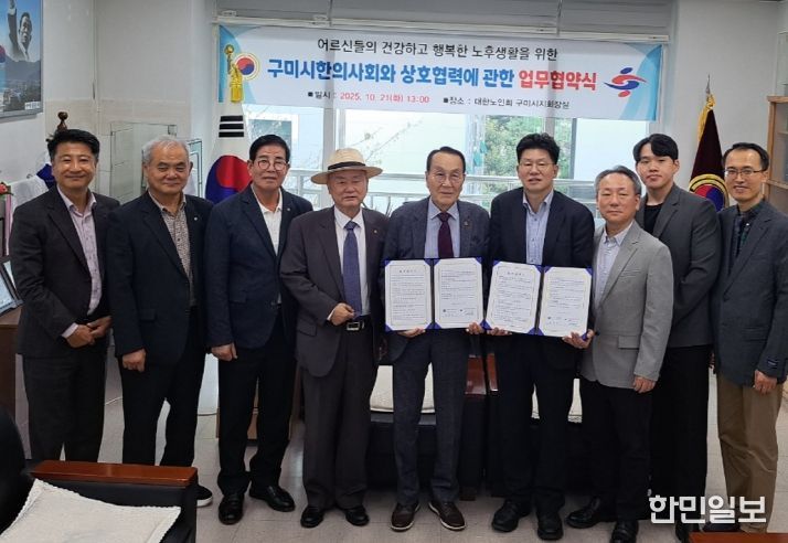 한민일보 서울포커스 김봉순 기자 | (사)대한노인회구미시지회(회장 이재호)와 구미시한의사회(회장 진용인)가 지난 21일 구미노인종합복지관 지회장실에서 어르신 건강증진 및 노인성 질환 예방을 위한 ‘행복경로당 주치의 사업’업무협약을 체결했다.