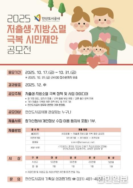 한민일보 서울포커스 임철현 기자 | 안산도시공사는 ‘2025년 저출생지방소멸 극복 시민제안 공모전’을 열고 시민과 함께 인구문제 극복방안을 모색하고 시민 체감형 정책·사업 발굴에 나선다고 22일 밝혔다.