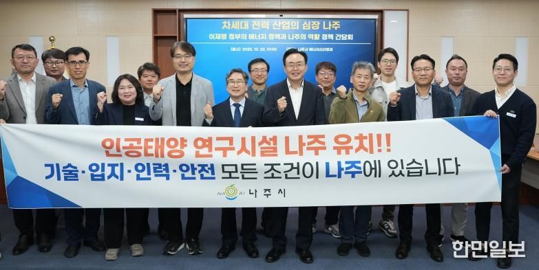 또한 간담회 참석자들은 ‘인공태양 연구시설 나주 유치’를 염원하는 퍼포먼스를 진행하며 정부 공모사업 대응 의지를 함께 다졌다.