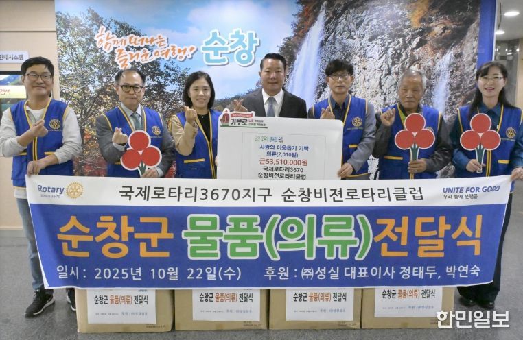 한민일보 서울포커스 김용택 기자 | 국제로타리 3670지구 순창비전로타리클럽(회장 김광진)은 유·아동 및 성인 내의류 전문 생산업체인 ㈜성실로부터 총 2,010벌(시가 약 5,300만 원 상당)의 의류를 후원받아 순창군청에 기탁했다.