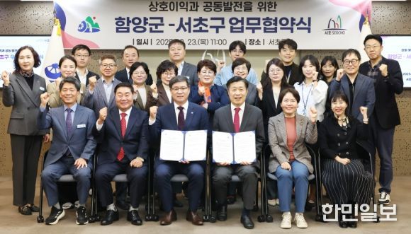 한민일보 서울포커스 김서윤 기자 | 함양군과 서울특별시 서초구가 10월 23일 오전 11시, 서초구청 5층 대회의실에서 문화·관광·산업 등 다양한 분야의 교류와 협력을 위한 협약을 체결했다.