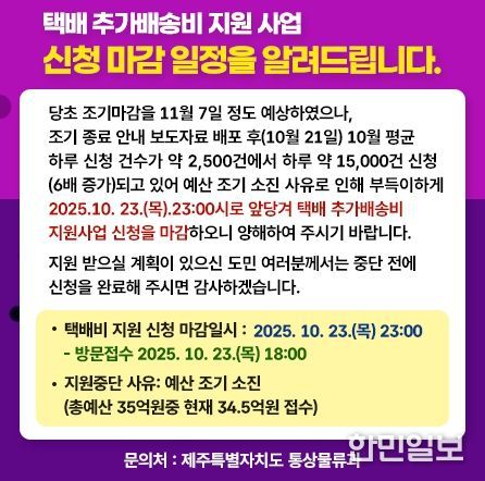 한민일보 서울포커스 임철현 기자 | 제주특별자치도는 택배 추가배송비 지원 사업이 당초 11월 7일 종료 예정이었으나, 신청 급증으로 10월 23일 오후 11시(방문 접수 오후 6시)에 조기 종료된다고 밝혔다.