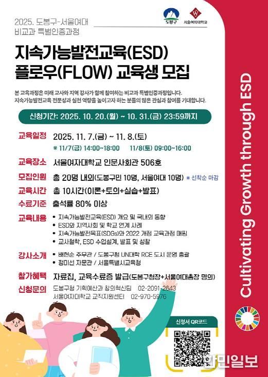 한민일보 서울포커스 김봉순 기자 | 서울 도봉구가 서울여자대학교와 함께 2025학년도 2학기부터 공동으로 ‘도봉-대학 ESD(지속가능발전교육) 캠퍼스’ 일환으로 ‘비교과 특별인증과정’을 운영한다.