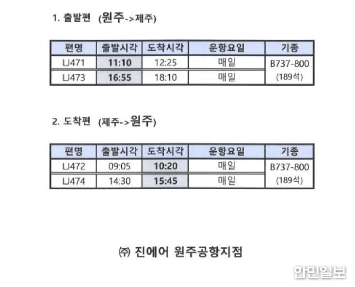 원주공항에 취항한 진에어의 동계 항공기 운항 일정이 국토교통부 최종 승인으로 확정됨에 따라, 10월 26일부터 원주공항에서 출발하는 제주행 항공편은 기존 오전 11시 10분·오후 5시 20분에서 오전 11시 10분·오후 4시 55분으로 변경된다.