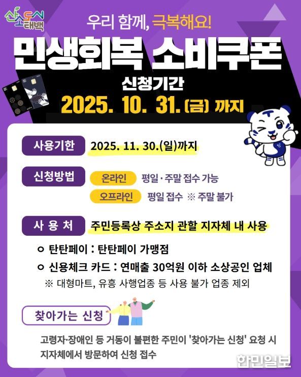 태백시 관계자는 “민생회복 소비쿠폰은 단순한 지원을 넘어 지역 상권을 살리는 마중물 역할을 하고 있다”며 “아직 신청하지 못한 시민은 기한 내 꼭 신청하고, 지급받은 쿠폰은 지역경제 활성화를 위해 기한 내 모두 사용해 주시길 바란다”고 말했다.