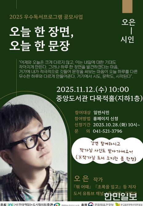한민일보 서울포커스 황준형 기자 | 천안시 중앙도서관은 내달 12일 ‘오은 작가와의 만남’을 진행한다고 24일 밝혔다.