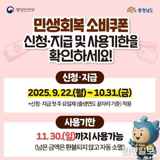 도 관계자는 “민생회복 소비쿠폰은 국민의 가계 부담을 덜고 지역경제를 회복하기 위한 실질적 민생 지원 정책”이라며 “신청 마감일은 10월 31일, 사용기한은 11월 30일까지인 만큼 기간 내 신청과 사용을 바란다”라고 강조했다.