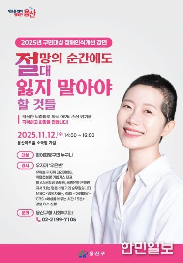 한민일보 서울포커스 김서윤 기자 | 서울 용산구가 11월 12일 오후 2~4시 용산아트홀(녹사평대로 150) 소극장 가람에서 구민을 대상으로, 2025년 하반기 장애인식개선 강연 ‘절망의 순간에도 절대 잃지 말아야 할 것들’을 개최한다.