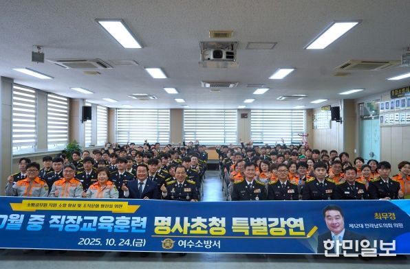 한민일보 서울포커스 임광현 기자 | 여수소방서(서장 서승호)는 10월 24일 본서에서 전 직원 및 의용소방대원을 대상으로 청렴·소통 강화 및 전기차 화재대응 특별교육, 명사 초청 공직자 교육을 실시했다.