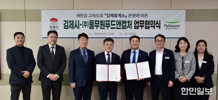 한민일보 서울포커스 박용남 기자 | 김제시는 27일 ㈜풀무원푸드앤컬처와 '새만금전주간' 고속도로 개통에 따라 새롭게 조성되는‘김제휴게소’운영에 따른 업무협약을 체결했다고 밝혔다.