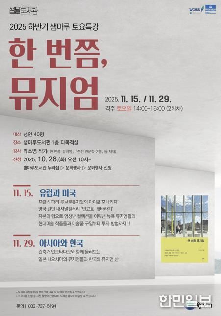 한민일보 서울포커스 임경복 기자 | 샘마루도서관에서는 시민들의 독서 문화 향유 기회를 확대하고자 『하반기 토요 특강』 프로그램의 두 번째 강좌인 [한 번쯤, 뮤지엄]을 운영한다.