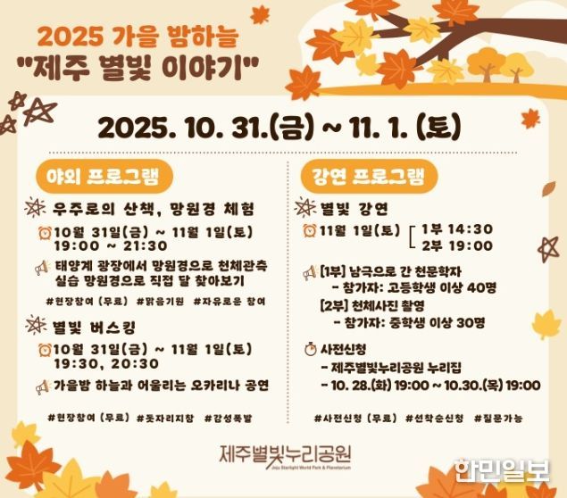 한민일보 서울포커스 김다남 기자 | 제주별빛누리공원은 10월 31일과 11월 1일 이틀간 누구나 자유롭게 참가할 수 있는 ‘2025년 가을 밤하늘 제주별빛이야기’ 행사를 개최한다.