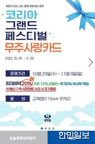 한민일보 서울포커스 박용남 기자 | 무주군은 오는 29일부터 11월 9일까지 진행되는 ‘코리아 그랜드 페스티벌 기간 동안 무주사랑상품권을 최대 20% 할인된 혜택으로 이용할 수 있다고 밝혔다.