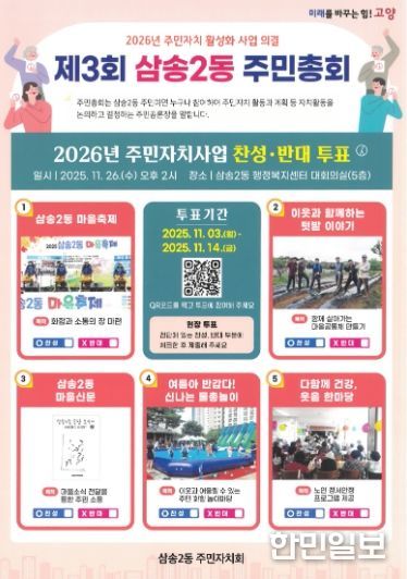 한민일보 서울포커스 김은금 기자 | 고양특례시 덕양구 삼송2동 주민자치회는 오는 11월 26일 개최될 ‘제3회 주민총회’를 앞두고, 2026년도 주민자치사업 선정을 위한 사전투표를 진행한다고 밝혔다.