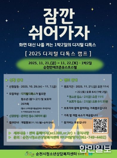 한민일보 서울포커스 임광현 기자 | 순천시는 청소년의 건강한 미디어 사용습관 형성과 가족 간 유대감 강화를 위해 '2025년 청소년 디지털 디톡스 캠프'를 오는 11월 21일부터 22일까지 순천만에코촌 유스호스텔에서 1박 2일 간 운영한다.