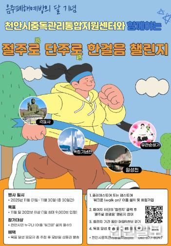 성준모 천안시중독관리통합지원센터장은 “시민들이 건강한 걷기 문화를 통해 자연스럽게 절주를 실천할 수 있도록 설계된 캠페인”이라며 “중독의 위험성을 인식하고, 건전한 생활습관으로 이어가는 계기가 되길 바란다”고 말했다.