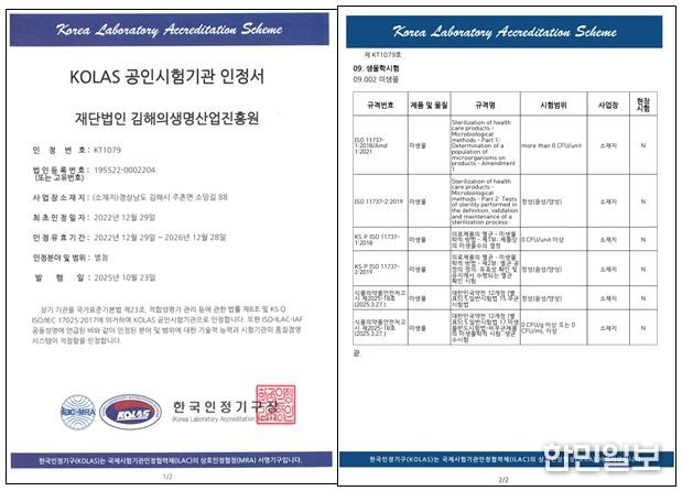 한민일보 서울포커스 김은금 기자 | 김해의생명산업진흥원은 최근 한국인정기구(KOLAS, Korea Laboratory Accreditation Scheme)로부터 공인시험기관 인정범위 확대 승인을 받았다고 밝혔다.