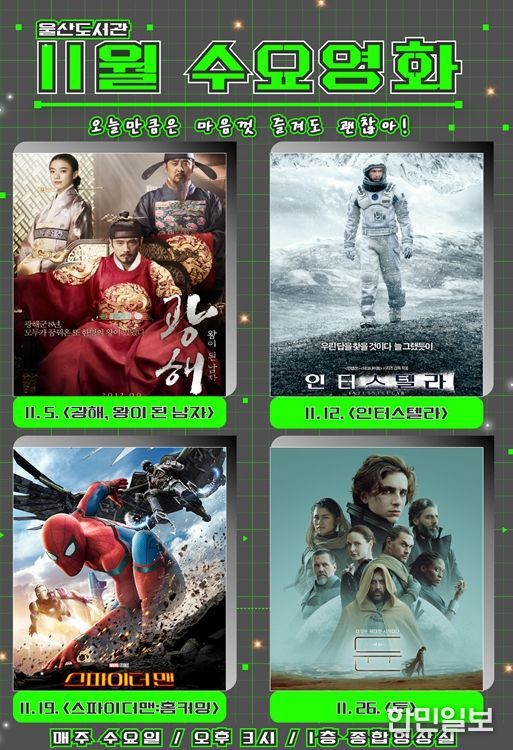 ▲11월 5일에는 왕의 대역으로 궁에 들어간 광대의 이야기를 그린 사극 ‘광해, 왕이 된 남자’ ▲11월 12일에는 미지의 우주로 떠나는 감동 여정을 담은 ‘인터스텔라’ ▲11월 19일은 유쾌한 액션과 에너지를 전하는 영웅(히어로) 영화 ‘스파이더맨: 홈커밍’ ▲11월 26일에는 사막 행성을 배경으로 운명과 권력을 둘러싼 서사를 그린 ‘듄’이 상영된다.