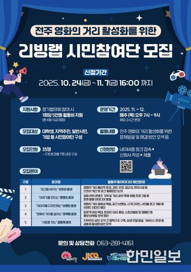 한민일보 서울포커스 김용택 기자 | 전주정보문화산업진흥원(원장 허전)과 우석대학교(총장 박노준)는 전북 RISE 1차 공모사업의 일환으로 ‘전주 영화의 거리 활성화를 위한 리빙랩’의 시민참여단을 모집한다고 밝혔다.