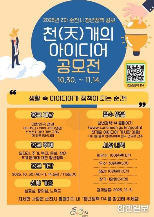 한민일보 서울포커스 임광현 기자 | 순천시는 청년들의 일상 속 고민과 아이디어를 정책으로 연결하는 2025년 청년정책 2차 『천(天)개의 아이디어』를 오는 14일까지 접수한다고 밝혔다.