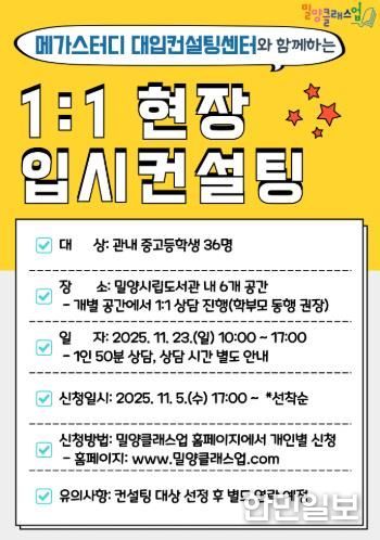한민일보 서울포커스 김은금 기자 | 경남 밀양시는 오는 23일 일요일 오전 10시부터 밀양시립도서관에서 ‘메가스터디 대입컨설팅센터와 함께하는 1:1 현장 입시컨설팅’을 개최한다고 3일 밝혔다.