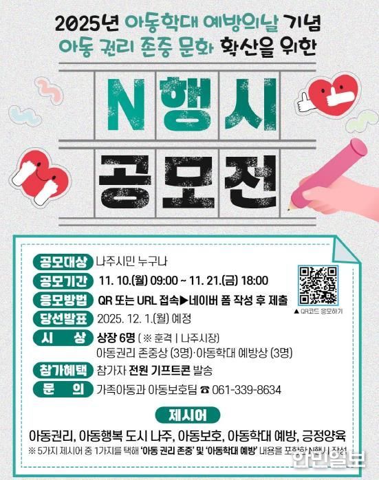 나주시 관계자는 “시민이 직접 참여해 아동의 권리와 학대 예방의 중요성을 함께 생각하는 의미 있는 공모전이 될 것으로 기대한다”고 밝혔다.