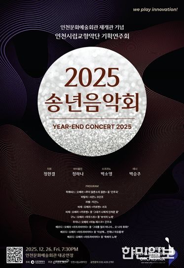 한민일보 서울포커스 유창렬 기자 | 인천시립교향악단이 한 해의 마지막을 화려하게 장식할 인천문화예술회관 재개관 기념 기획연주회 〈2025 송년음악회〉의 프로그램과 티켓 예매 일정을 전격 공개했다.