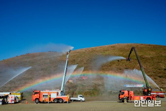 한민일보 서울포커스 최성훈 기자 | 제주특별자치도 소방안전본부는 3일 새별오름 일대에서 60명의 인원과 소방헬기를 포함한 13대의 장비를 동원해 유관기관 합동 산불 대응훈련을 실시했다.
