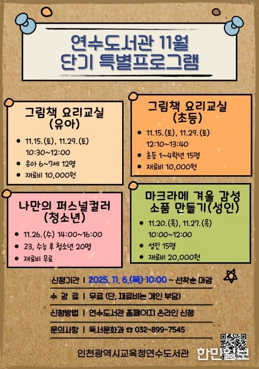 프로그램 신청은 11월 6일부터 연수도서관 누리집에서 선착순으로 가능하며, 자세한 문의는 독서문화과로 하면 된다.