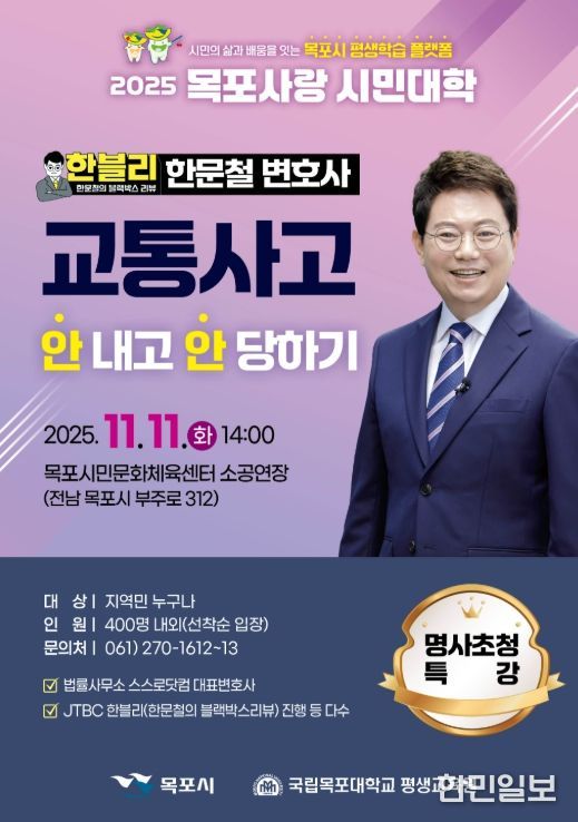 한민일보 서울포커스 임광현 기자 | 목포시는 오는 11월 11일 오후 2시 목포시민문화체육센터에서 한문철 변호사를 초청해 ‘교통사고 안 내고 안 당하기’를 주제로 특강을 연다.