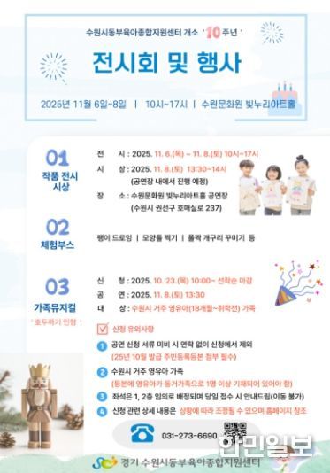 한민일보 서울포커스 진광성 기자 | 경기 수원시동부육아종합지원센터는 개소 10주년을 맞아 8일까지 수원문화원 빛누리아트홀에서 문화·예술 중심의 기념행사를 개최한다.