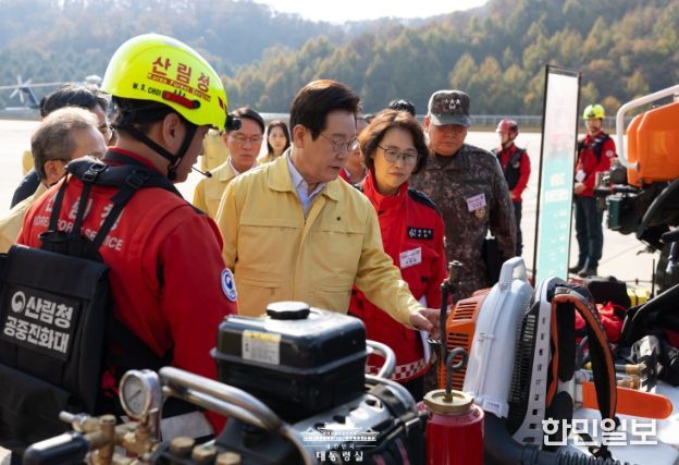 이 대통령은 먼저 강원 원주시에 위치한 산림청 산림항공본부를 찾아 산림청과 군(軍)의 산불 진화 헬기, 드론, 차량 등 핵심 장비를 점검했다.