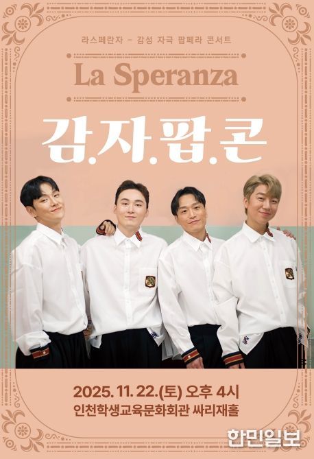 한민일보 서울포커스 유창렬 기자 | 인천광역시교육청학생교육문화회관은 11월 22일 오후 4시, 대공연장 싸리재홀에서 대한민국 최초의 팝페라팀 라스페란자의 공연 ‘라스페란자 감자팝콘’을 개최한다.