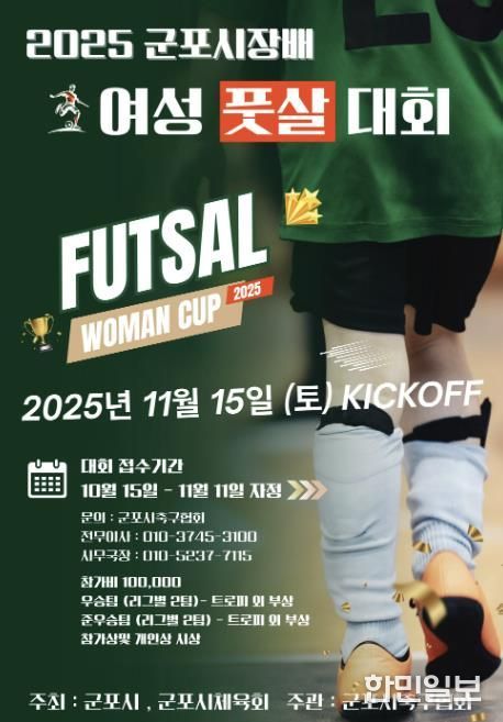 한민일보 서울포커스 임경복 기자 | 군포시는 여성 생활체육 참여 확대와 건전한 스포츠 문화 확산을 위해 ‘2025 군포시장배 여성 풋살대회’를 오는 11월 15일(토) 군포시 국민체육센터 축구장에서 개최한다.