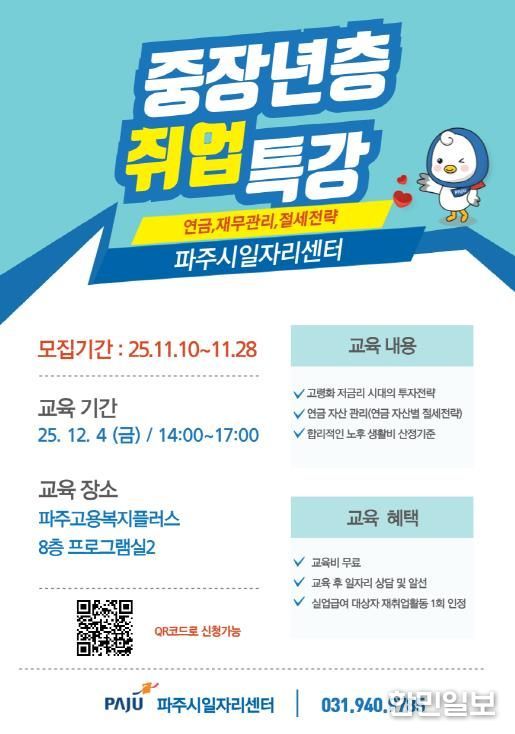 한민일보 서울포커스 진광성 기자 | 파주시는 오는 11월 10일부터 28일까지 ‘중장년층 취업 특강’에 참여할 교육생 15명을 선착순으로 모집한다.