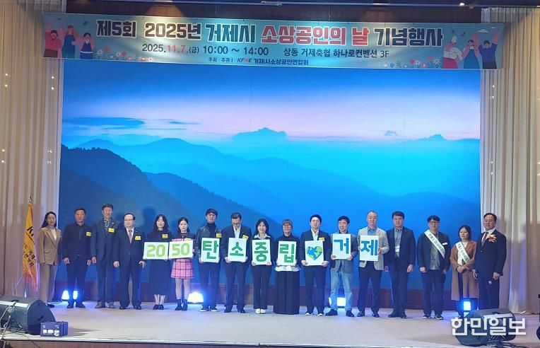 한민일보 서울포커스 김은금 기자 | 거제시는 지난 7일, 거제하나로컨벤션에서 열린 ‘2025년 소상공인의 날 기념행사’에서 소상공인들과 함께 탄소중립 실천 다짐 퍼포먼스를 진행하며 실천문화 확산에 나섰다.