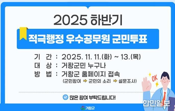 한민일보 서울포커스 김서윤 기자 | 거창군은 오는 11일부터 13일까지 ‘2025년 하반기 적극행정 우수공무원 및 우수사례’를 선정하기 위한 군민 온라인 투표를 실시한다.