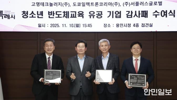한민일보 서울포커스 김성윤 기자 | 용인특례시는 10일 시청 접견실에서 ㈜서플러스글로벌과 업무협약(MOU)을 체결하고, 지역 청소년 반도체 교육에 기여한 기업 3곳에 감사패를 수여했다고 11일 밝혔다.