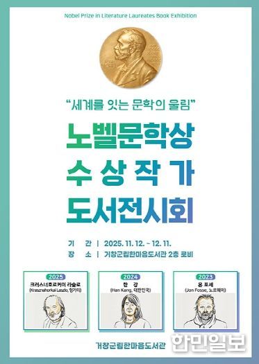 한민일보 서울포커스 김서윤 기자 | 거창군은 2025년 노벨문학상 발표를 기념하여 군민들의 높아진 문학적 관심을 반영하고 세계문학의 흐름을 조명하기 위해 오는 12일부터 12월 11일까지 한 달간 한마음도서관에서 ‘노벨문학상 수상 작가 도서 전시회’를 개최한다.