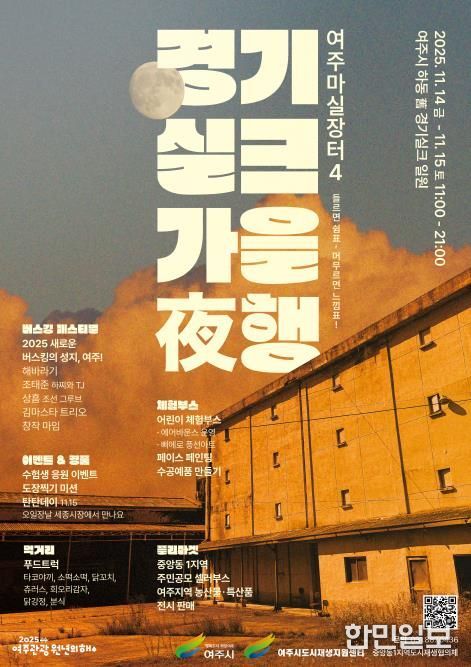 한민일보 서울포커스 전희주 기자 | 여주시는 오는 11월 14일부터 15일까지 이틀간 여주 경기실크 일원(여주시 하동 123-6번지)에서 '여주마실장터4 가을야행'을 개최한다고 밝혔다. 이번 행사는 '2025 새로운 버스킹의 성지, 여주!'라는 슬로건 아래, 깊어가는 가을밤의 정취를 더할 버스킹 페스티벌과 함께 다채로운 마켓과 체험을 선보일 예정이다.