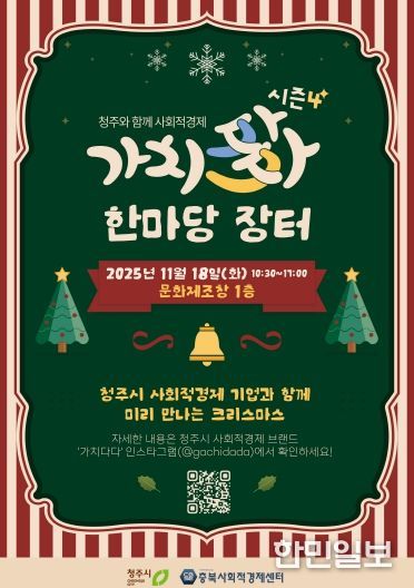 한민일보 서울포커스 김다남 기자 | 청주시는 오는 18일 청원구 내덕동 문화제조창 1층에서 ‘제4회 청주시 사회적경제 가치多다 한마당 장터’를 개최한다고 밝혔다.