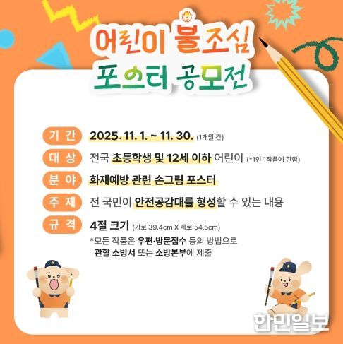 한민일보 서울포커스 박용남 기자 | 해남소방서가 11월 불조심 강조의달을 맞아 이달 21일까지 지역 내 초등학생 및 12세 이하 어린이를 대상으로 불조심 포스터 공모전을 개최한다.