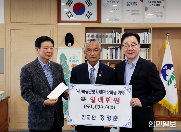 한민일보 서울포커스 김서윤 기자 | 하동군장학재단(이사장 이양호)은 지난 11일 진교면 평당마을에 사는 정영춘 씨가 지역인재 육성을 위해 써 달라며 100만 원의 장학기금을 전달했다고 밝혔다.