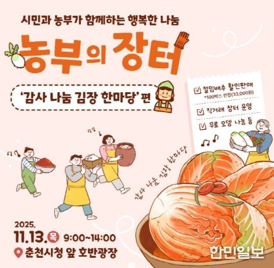 ‘춘천시 농부의 장터- 감사 나눔 김장 한마당편’이 13일 오전 9시부터 오후 2시까지 시청광장에서 열린다. 이 행사는 한 해 동안 직거래 장터를 통해 시민의 사랑을 받아온 지역 농가들이 감사의 뜻을 전하기 위해 자발적으로 마련한 자리다.