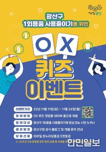 한민일보 서울포커스 박용남 기자 | 광주 광산구가 일상에서 일회용품 사용을 줄이기 위한 시민들의 인식 개선과 친환경 실천 확산을 위해 ‘일회용품 사용 줄이기 OX 퀴즈 행사’를 진행한다.