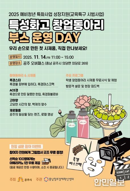 한민일보 서울포커스 박덕환 기자 | 공주시와 (재)충남창조경제혁신센터는 오는 11월 14일 오전 11시부터 오후 3시까지, 공주시 의당면 소재 오버패스 카페에서 ‘특성화고 창업동아리 시제품 전시·체험 행사’를 개최한다.