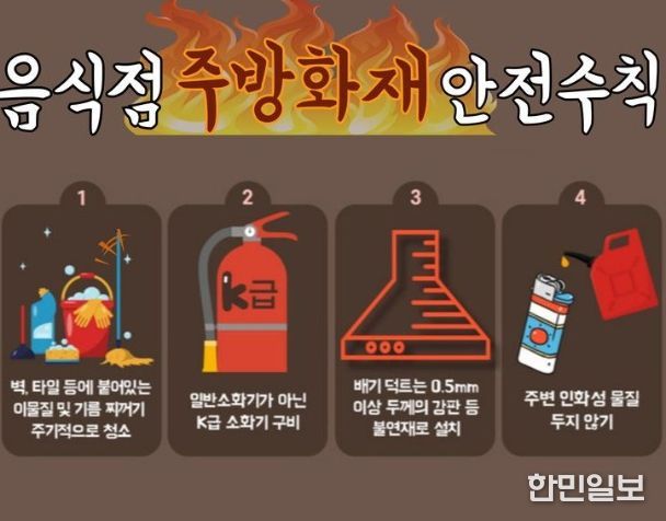 김종욱 천안서북소방서장은 “음식점 주방은 화기 사용이 많고 기름이 쉽게 쌓이는 환경인 만큼, 주기적인 청소와 함께 K급 소화기 비치가 필수”라며 “조리 중 자리를 비우지 않고 주변에 인화성 물질을 두지 않는 등 기본 안전수칙을 준수해 달라”고 당부했다.